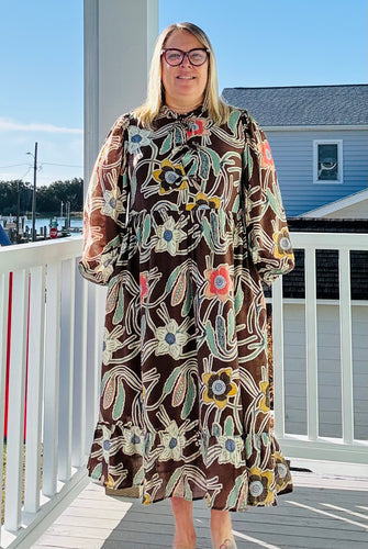 Brown Floral print midi dress with frilled neck